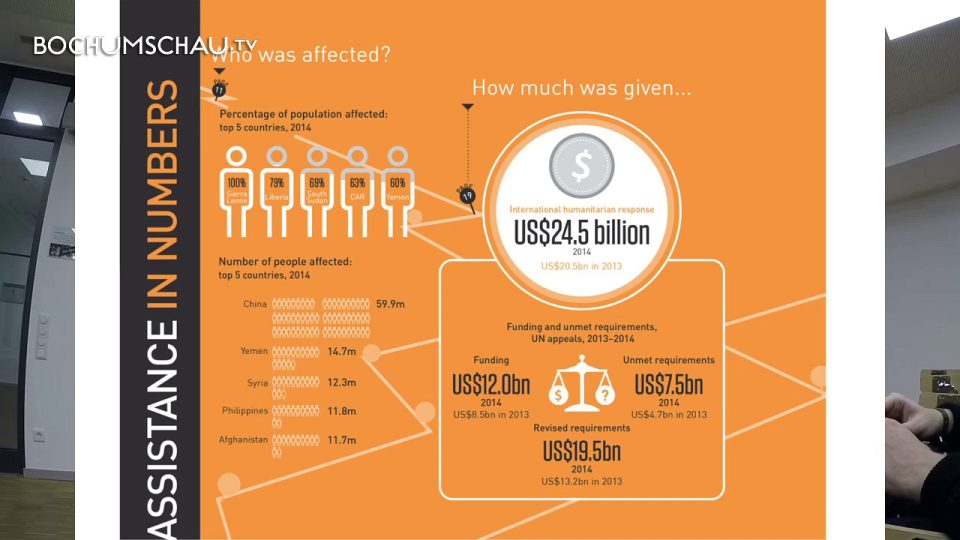 Dennis Dijkzeul: „Bevor ich es vergesse, im letzten Jahr gab es eine international humanity response im Wert von 24,5 Milliarden. Also die humanitäre Hilfe ist langsam ein wichtiger Wirtschaftszweig geworden. Wichtig dabei ist nachzugehen, dass es 7,5 Milliarden zu wenig gab, man hat den Bedarf ausgerechnet, das macht die UNO, da gibt´s ein ganzes System dafür. Was man ausgerechnet hatte, was man brauchte, es gab noch immer einen Mangel von 7,5 Milliarden US-Dollar. Das ist ein Problem, weil das bedeutet, dass viele Leute mehr Hilfe brauchen, als sie bekommen. Wenn die Leute keine Hilfe bekommen und die Situation durchaus schlecht ist, was werden die Leute dann machen? Sie werden flüchten.