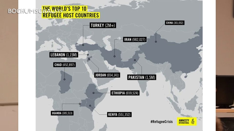 „Hier sehen Sie wie die Erstantragszahlen zunehmen in diesem Jahr und wir wissen, dass die jetzt schon wieder nach unten gehen, die gehen immer im Winter nach unten. Weil im Winter ist es schwierig über das Mittelmeer nach Europa zu kommen. Die Große Frage wird wieder sein: Was passiert, wenn es dann wieder so März ist? März, Mai wenn die Zahlen wieder zunehmen. Eine Studentin von mir hat mit MSF, also mit Ärzte ohne Grenzen war sie auf dem Boot im Mittelmeer und sie sagte: «Es war die schwierigste Aufgabe, die ich je für MSF gemacht habe.» Und sie war in Süd-Sudan und in Jemen und die hat so viel erlebt, kommt selbst aus dem Libanon, also die hat eine Menge an Erfahrung. Aber sie hat immer das Gefühl gehabt, eigentlich sollte ich hier überhaupt nicht sein… auf einem Boot. Irgendwie sollte man anders mit diesen Menschen umgehen können. Deswegen war das eben emotional, praktisch nicht, aber emotional hat sie das als sehr schwierig erfahren. Wir denken natürlich jetzt seien viele Flüchtlinge hier, aber gucken wir mal anderswo in der Welt. Die Türkei hat jetzt schon mehr als 2 Mio. Flüchtlinge. Das kleine Libanon hat 1,15 Mio. Flüchtlinge und die Bevölkerung ist etwa 4 Mio., das bedeutet, dass wenn wir das mit Deutschland vergleichen, auch wieder pi mal Daumen, dass Deutschland schon mehr als 20 Mio. Flüchtlinge hätte, wenn man das vergleicht mit Libanon. Chad hat einfach Pech, Chad hat Flüchtlinge der Zentralafrikanischen Republik, von Boko Haram und Nigeria und von Darfur. Dann hat es schon fast eine halbe Million, Iran hat fast eine Million, Pakistan 1,5 Mio., Kenya immerhin noch eine halbe Million und viele andere Länder. Das sind nur die 10 wichtigsten Refugee Hosting Countries. In dieser Hinsicht haben wir in Europa noch nicht ein großes Problem, aber in dieser Hinsicht können wir erwarten, dass die Probleme in Europa in der Zukunft eher größer werden.“
