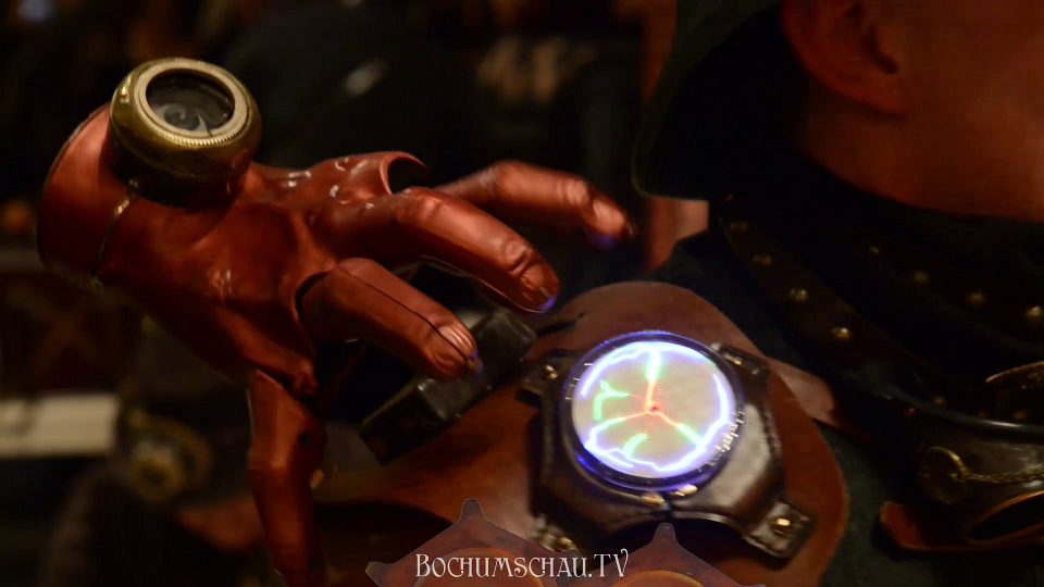 „Bei uns ist es mittlerweile so, dass wir eigentlich immer Steampunk sind, es sei denn wir sind gerade am arbeiten. Also bei der Arbeit, klar da führt jeder sein normales Alltagsleben, aber der Steampunk hält auch Einzug in das Privatleben. Es ist also durchaus so, dass man mal einen Gehrock oder eine Weste mit Hemd auch mal im Privaten trägt, jetzt nicht immer nur T-Shirt und Jeans. Unsere Wohnung, Wohnzimmer, voller Accessoires, also wo andere Leute Designer-Möbel stehen haben oder Designer-Kram, da stehen bei uns halt solche umgebauten Sachen. Die Wohnung passt sich so ein bisschen an, also das hält durchaus Einzug in den ganz normalen Alltag, das ganz normale Privatleben. Wir verstehen uns als Wupperdampf Laboratorium als ganzes, wir verstehen uns eigentlich der Maker-Szene zugehörig. Eigentlich bauen alle Steampunks auch irgendwas, auch wenn es nur ein paar Brillen für den Hut sind, ein paar so genannte „Goggles“. Es gibt auch ein paar Leute, die nur Wert auf die Kostüme oder auf das Outfit legen, das gibt es auch, es gibt Leute, die sich nur auf die Kostüme beziehen. Bei uns gehört es alles zusammen, es ist ein Zusammenspiel von allem. Das Outfit sollte stimmen, man sollte ein paar Ideen haben, irgendwie was bauen, und dann läuft das Ganze.“