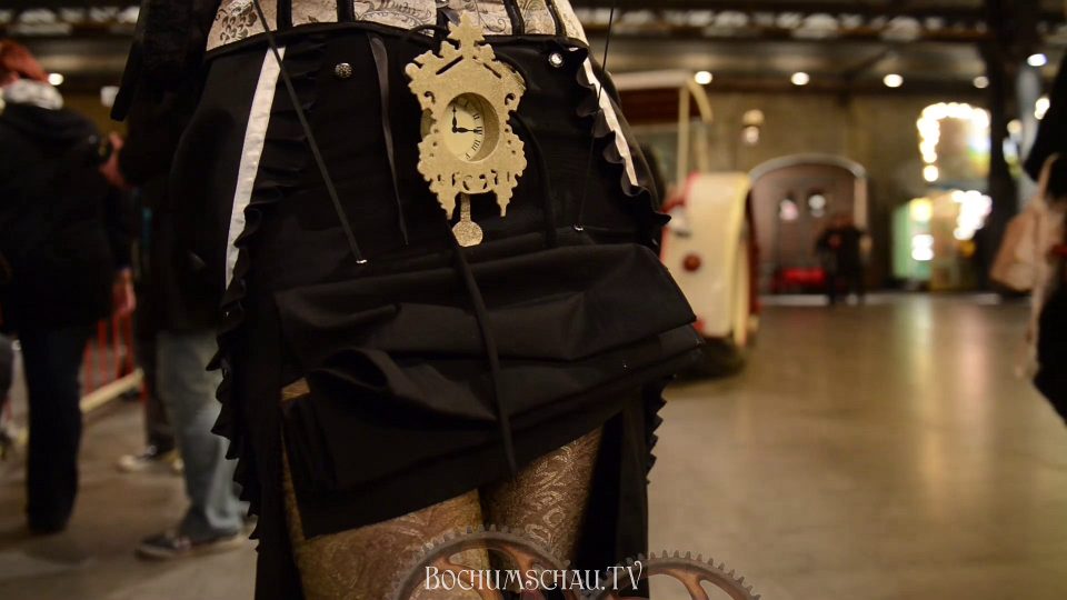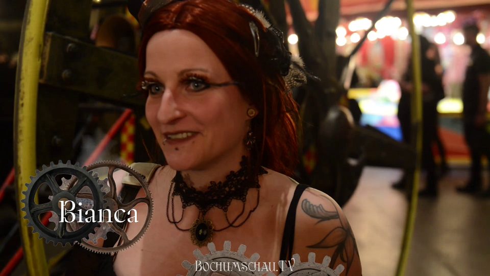 „Also ich mische halt Steampunk mit ein bisschen Endzeit. Apokalyptisches Endzeit-Szenario, mit Atomkrieg. Ja, alles selbst kreiert… also das hier ist eine ganz normale Gasmaske mit ein bisschen Moosgummi und ein bisschen kreativ rumexperimentiert. Also ich komme ja von ein bisschen weiter weg, Baden-Württemberg, und ich finde es einfach super, dass es hier in Bochum auch so etwas mal gibt… Ich bin mit meiner Mutter hier.“